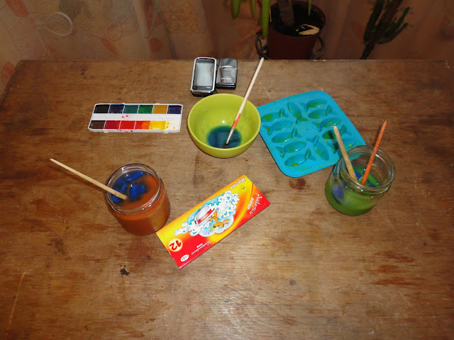 Затем отправились на запад. Это была как бы осень. И все становится цветным. Я заморозила синюю и желтую воду в форме рыбок. Мы сделали банку красной и банку желтой воды и запускали туда рыбок и смотрели, как меняется цвет. Потом в якобы оранжевую воду запустили синих рыбок тоже =)